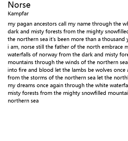 my pagan ancestors call my name through the white waterfalls of norway from the dark and misty forests from the mighty snowfilled mountains through the winds of the northern sea it's been more than a thousand years but still i am proud still i am, norse still the father of the north embrace my soul through the white waterfalls of norway from the dark and misty forests from the mighty snowfilled mountains through the winds of the northern sea let the fields and homes turn into fire and blood let the lambs be wolves once again i feel a pagan breeze from the storms of the northern sea let the northland of supreme be the north of my dreams once again through the white waterfalls of norway from the dark and misty forests from the mighty snowfilled mountains through the winds of the northern sea |