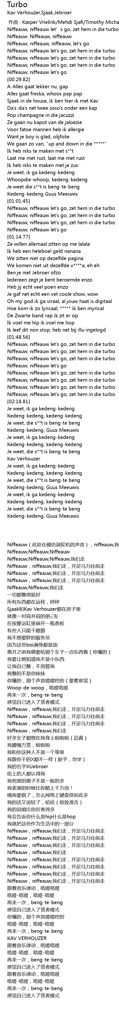 | [01:52.07] | Niffeauw, niffeauw let's go, zet hem in die turbo |