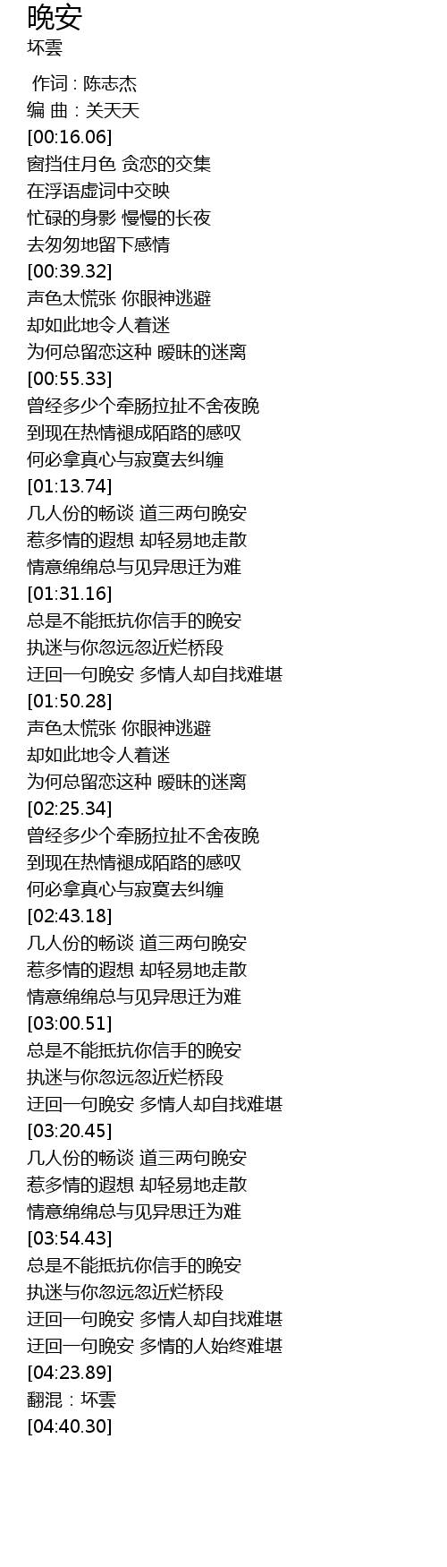 | [04:03.87] | 迂回一句晚安 多情人却自找难堪 |
