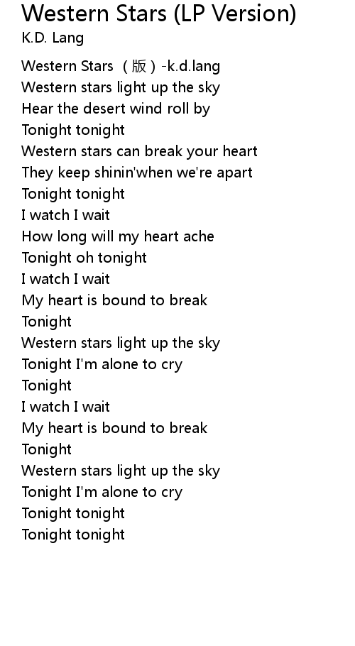 | [00:00.00] | Western Stars (版)-k.d.lang |