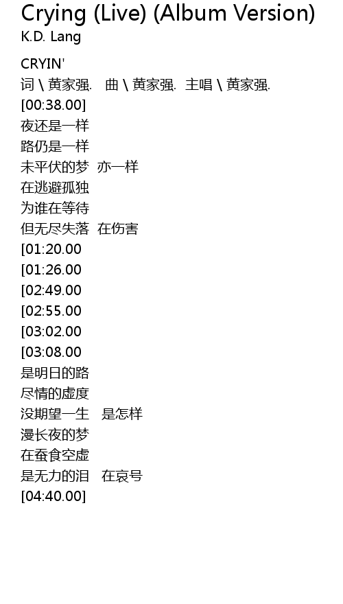 | [00:18.00] | 词 \ 黄家强. 曲 \ 黄家强. 主唱 \ 黄家强. |