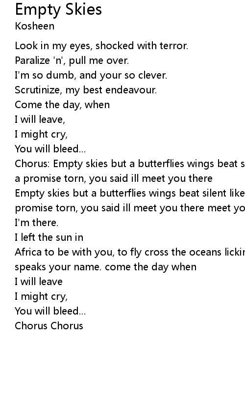 | Chorus: Empty skies but a butterflies wings beat silent like air call us free by a promise torn, you said ill meet you there | |