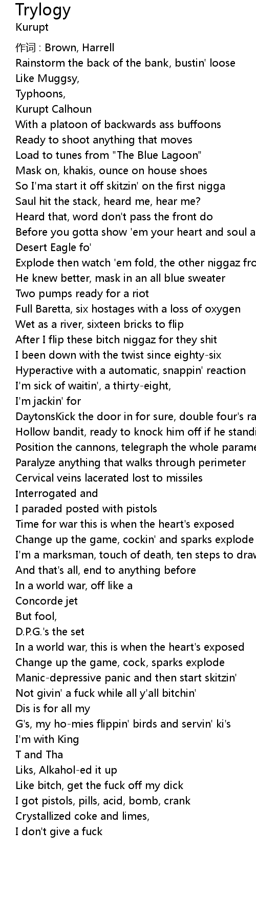 | G's, my ho-mies flippin' birds and servin' ki's | |