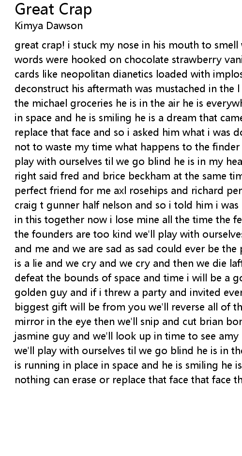 great crap! i stuck my nose in his mouth to smell what he was saying and his words were hooked on chocolate strawberry vanilla isophonic charles in charge cards like neopolitan dianetics loaded with implosives and ready to self deconstruct his aftermath was mustached in the l ron cupboard with the rest of the michael groceries he is in the air he is everywhere he is running in place in space and he is smiling he is a dream that came to me nothing can erase or replace that face and so i asked him what i was doing in my mind and he told me not to waste my time what happens to the finder once you've found the find we'll play with ourselves til we go blind he is in my head his chair's on bread he is right said fred and brice beckham at the same time he's the recipe for the perfect friend for me axl rosehips and richard persimmons in a soothing pot of craig t gunner half nelson and so i told him i was losing my mind he said we're in this together now i lose mine all the time the feelings steal the findings if the founders are too kind we'll play with ourselves til we go blind i see you and me and we are sad as sad could ever be the past is a corpse and the future is a lie and we cry and we cry and then we die laffing some people that i meet defeat the bounds of space and time i will be a golden girl and you will be a golden guy and if i threw a party and invited everyone i knew i will see the biggest gift will be from you we'll reverse all of the peepholes and look the mirror in the eye then we'll snip and cut brian bonsall and turn him into jasmine guy and we'll look up in time to see amy grant sir mix-a-lot the sky and we'll play with ourselves til we go blind he is in the air he is everywhere he is running in place in space and he is smiling he is a dream that came to me nothing can erase or replace that face that face that face that face that face |