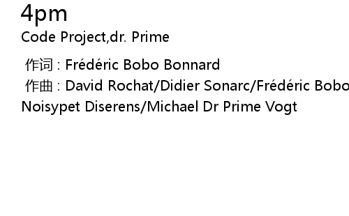 | [00:00.000] | 作曲 : David Rochat/Didier Sonarc/Frédéric Bobo Bonnard/Marc Noisypet Diserens/Michael Dr Prime Vogt |