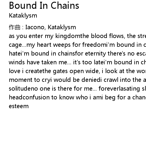 | as you enter my kingdomthe blood flows, the stream growslocked inside this cage... my heart weeps for freedomi' m bound in chainsi' m a prisoner of your hatei' m bound in chainsfor eternity there' s no escapei' m bound in chainsthe winds have taken me... it' s too latei' m bound in chainsdarkness takes all the love i createthe gates open wide, i look at the world outsideif i took one moment to cryi would be deniedi crawl into the abyssi taste the fruit of solitudeno one is there for me... foreverlasating sleepwhirlwind inside my headconfusion to know who i ami beg for a chance to redeemto take back my self esteem |