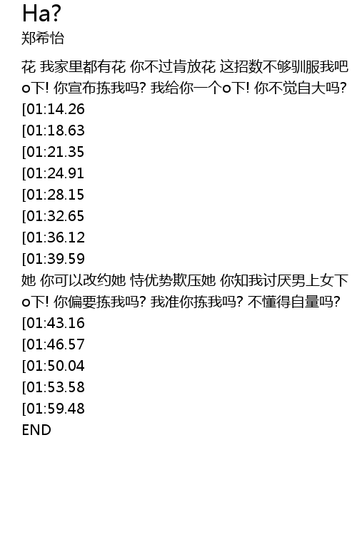 | [01:00.13] | 她 你可以改约她 恃优势欺压她 你知我讨厌男上女下 |