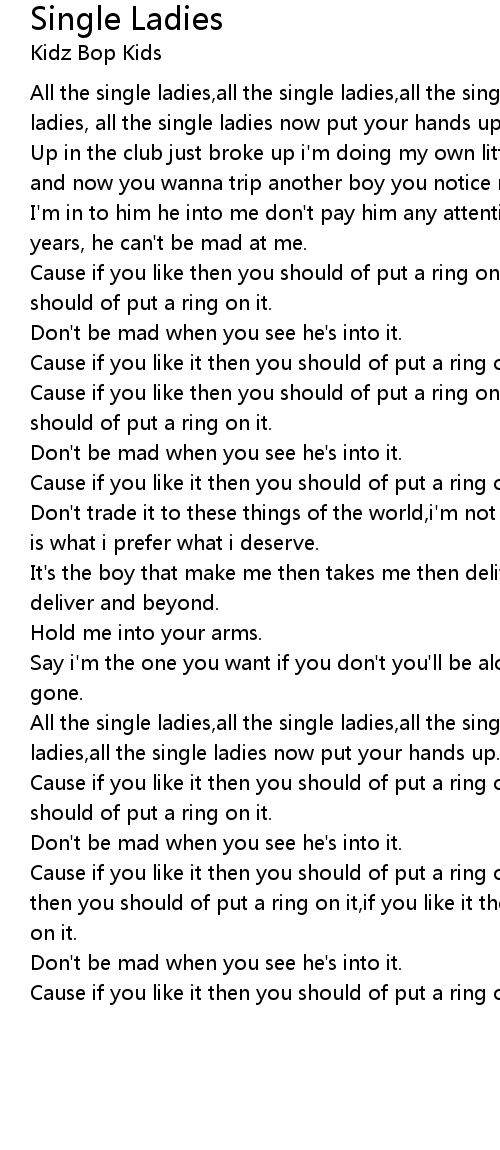 All the single ladies,all the single ladies,all the single ladies,all the single ladies,all the single ladies now put your hands up. |