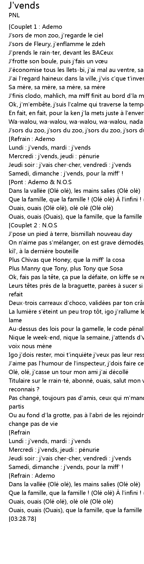 | [02:25.01] | Nique le weekend, nique la semaine, j' attends d' voir ou cette petite voix nous me ne |