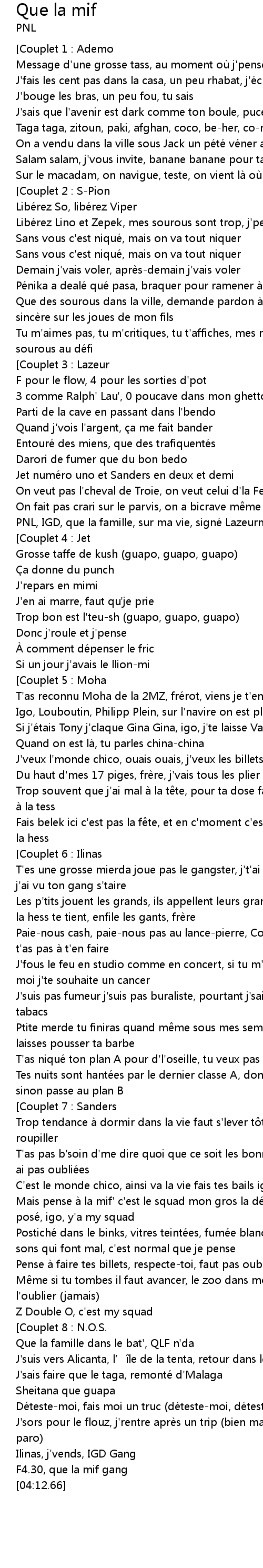 | [01:38.45] | PNL, IGD, que la famille, sur ma vie, signé Lazeurmi |