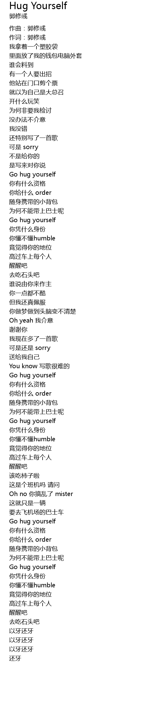 | [00:53.95] | Go hug yourself |