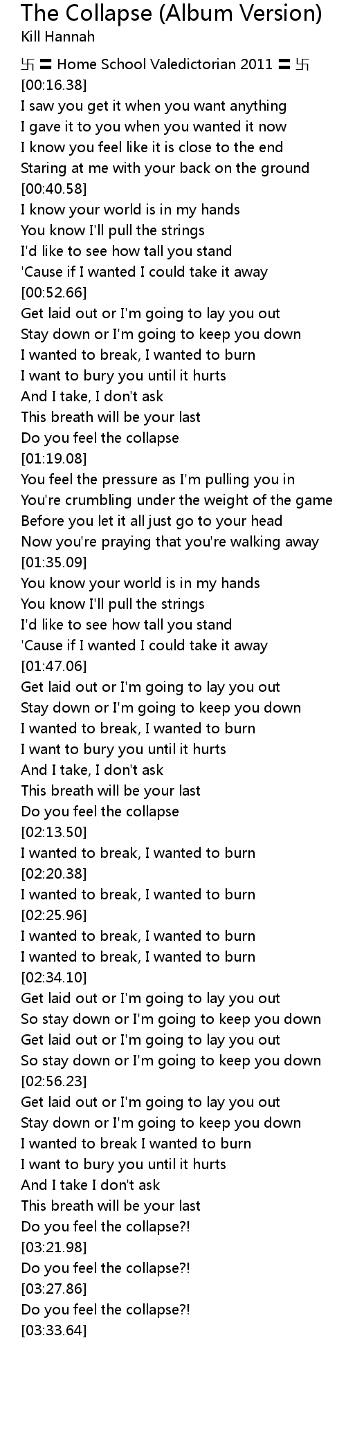 | [03:02.65] | Stay down or I'm going to keep you down |