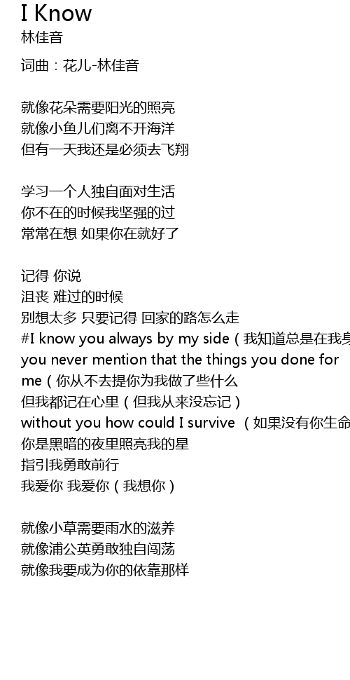 | I know you always by my side wo zhi dao zong shi zai wo shen pang | |