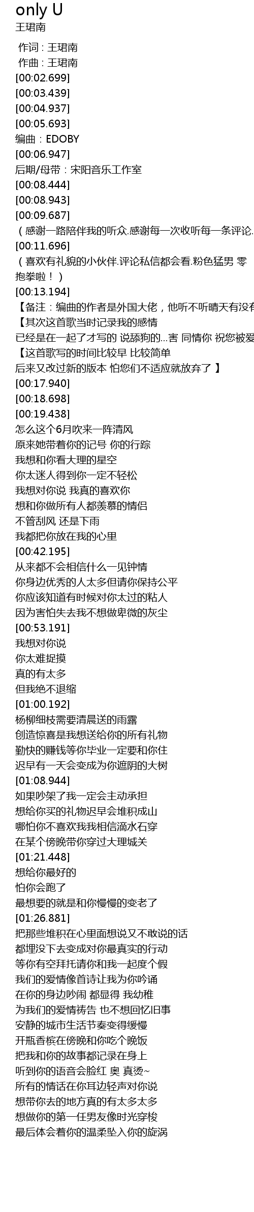 | [00:15.943] | 【其次这首歌当时记录我的感情 已经是在一起了才写的 说舔狗的...害 同情你 祝您被爱】 |