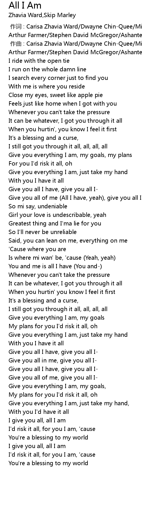 | [00:00.000] | 作词 : Carisa Zhavia Ward/Dwayne Chin-Quee/Mitchum Khan Chin/Jason Arthur Farmer/Stephen David McGregor/Ashante Reid/Skip Marley-Minto |