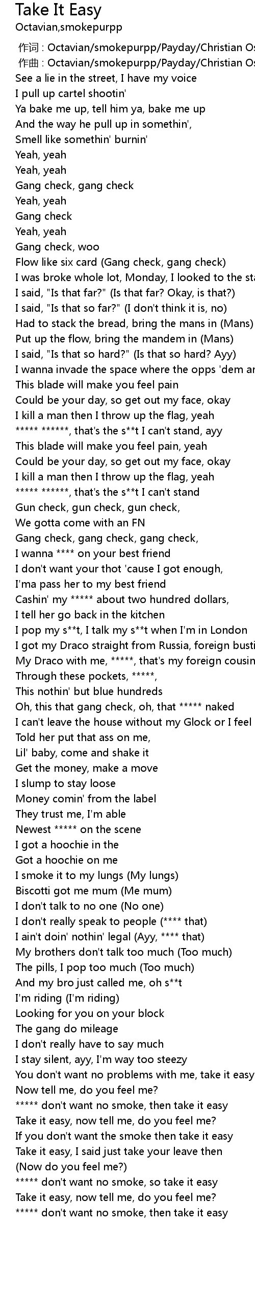| [02:41.11] | ***** don't want no smoke, so take it easy |