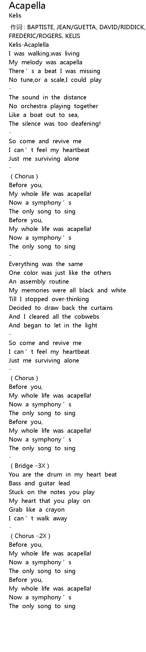 | [00:00.00] | 作词 : BAPTISTE, JEAN/GUETTA, DAVID/RIDDICK, MAKEBA/RIESTERER, FREDERIC/ROGERS, KELIS |