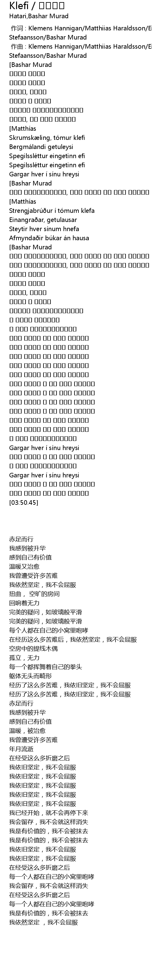 | [00:00.000] | zuò cí : Klemens Hannigan Matthiias Haraldsson Einar Hrafn Stefaansson Bashar Murad |