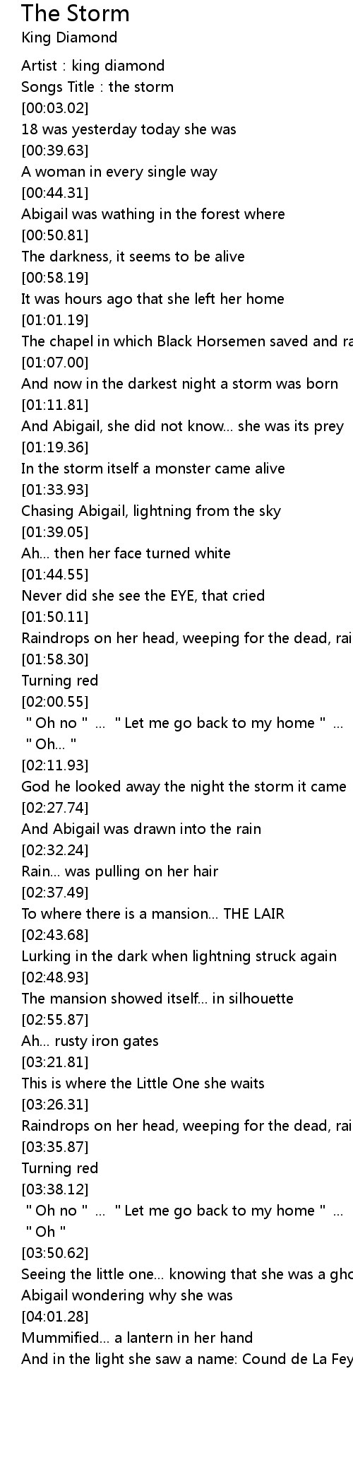 | [01:34.62] | Chasing Abigail, lightning from the sky |