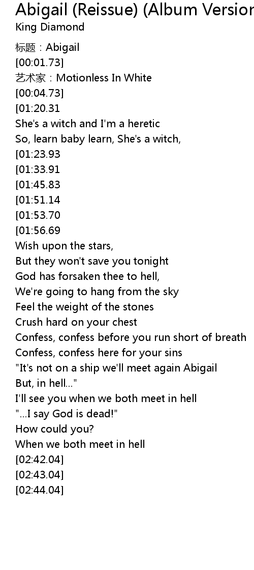 | [00:24.21][01:33.91][01:41.90] | Oh Abigail how could you do this to us? |