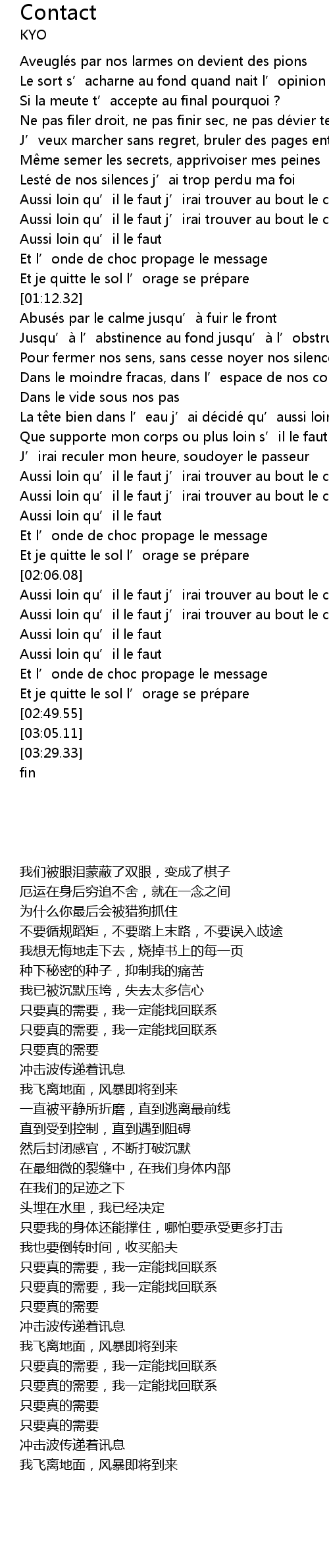 | [00:43.64] | Aussi loin qu’il le faut j’irai trouver au bout le contact |