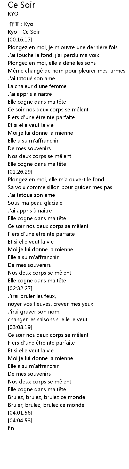 | [00:57.44] | Ce soir nos deux corps se m lent |