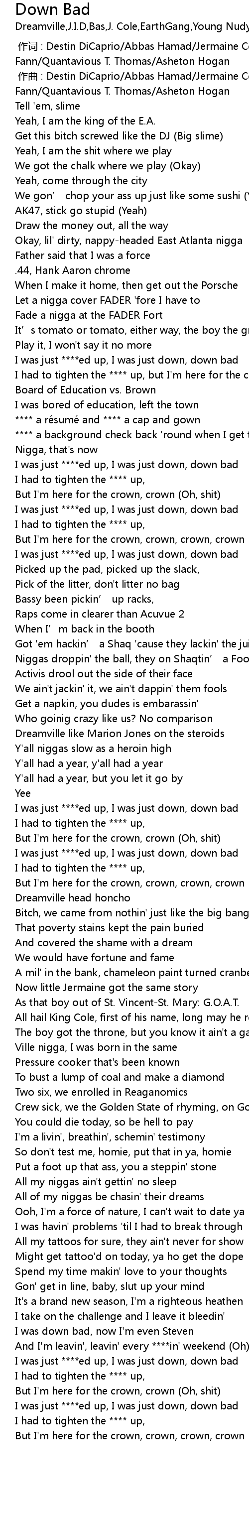 | [00:57.57] | I was just ****ed up, I was just down, down bad |