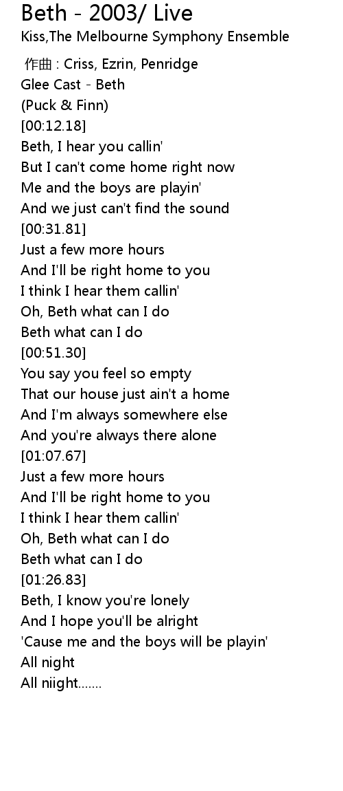 | [00:16.01] | Beth, I hear you callin' |
