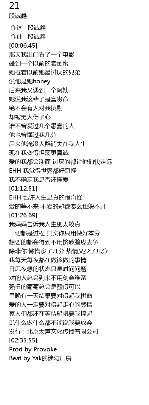 | [00:00.000] | 作词 : 段诚鑫 |