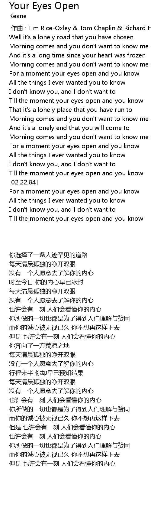 | [00:00.00] | zuò qǔ : Tim RiceOxley Tom Chaplin Richard Hughes |