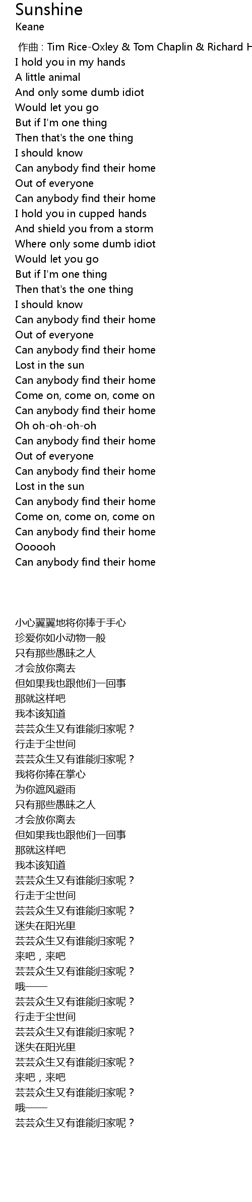 | [00:00.00] | zuò qǔ : Tim RiceOxley Tom Chaplin Richard Hughes James Sanger |