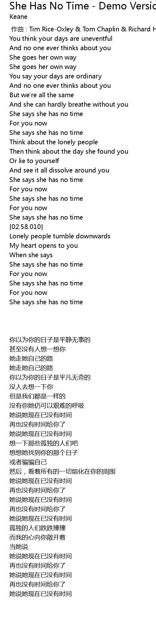 | [02:15.000] | She says she has no time |