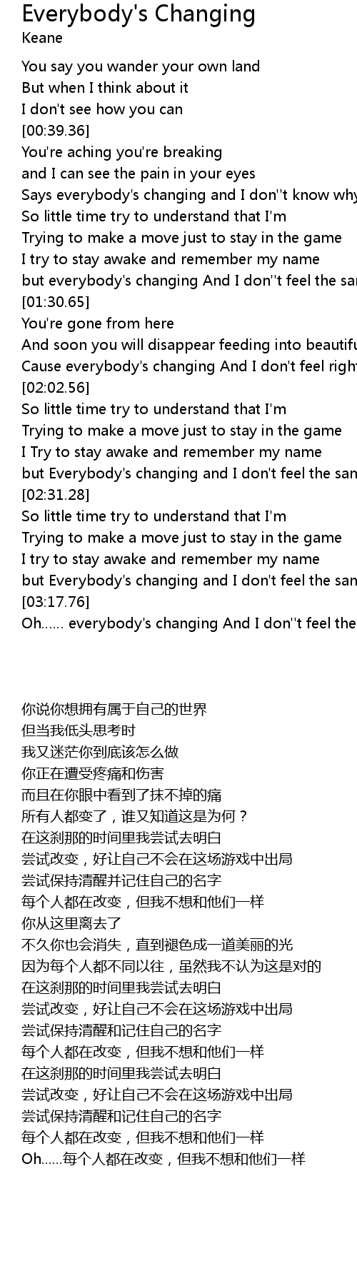 | [03:19.28] | Oh everybody' s changing And I don'' t feel the same |