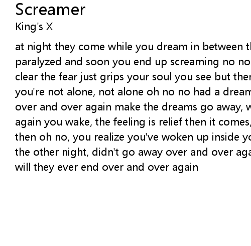 at night they come while you dream in between the wake and sleep then you feel paralyzed and soon you end up screaming no no no sometimes the voices are so clear the fear just grips your soul you see but there's nothing there you know you're not alone, not alone oh no no had a dream the other night, didn't go away over and over again make the dreams go away, will they ever end over and over again you wake, the feeling is relief then it comes, vibrations so strange and then oh no, you realize you've woken up inside your dream no no no had a dream the other night, didn't go away over and over again make the dreams go away, will they ever end over and over again |