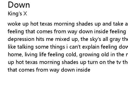 | woke up hot texas morning shades up and take a pee the weather... that empty feeling that comes from way down inside feeling down again it's raining depression hits me mixed up, the sky's all gray the phone rings i don't feel like talking some things i can't explain feeling down again feeling low, no one home, living life feeling cold, growing old in the night feeling down again woke up hot texas morning shades up turn on the tv the weather and that empty feeling that comes from way down inside |