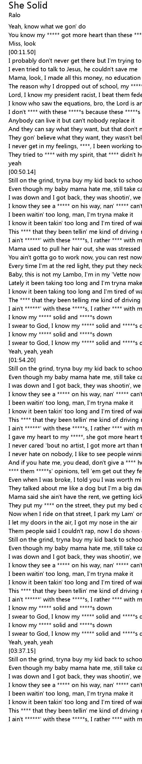 | [01:50.65] | I swear to God, I know my ***** solid and *****s down |