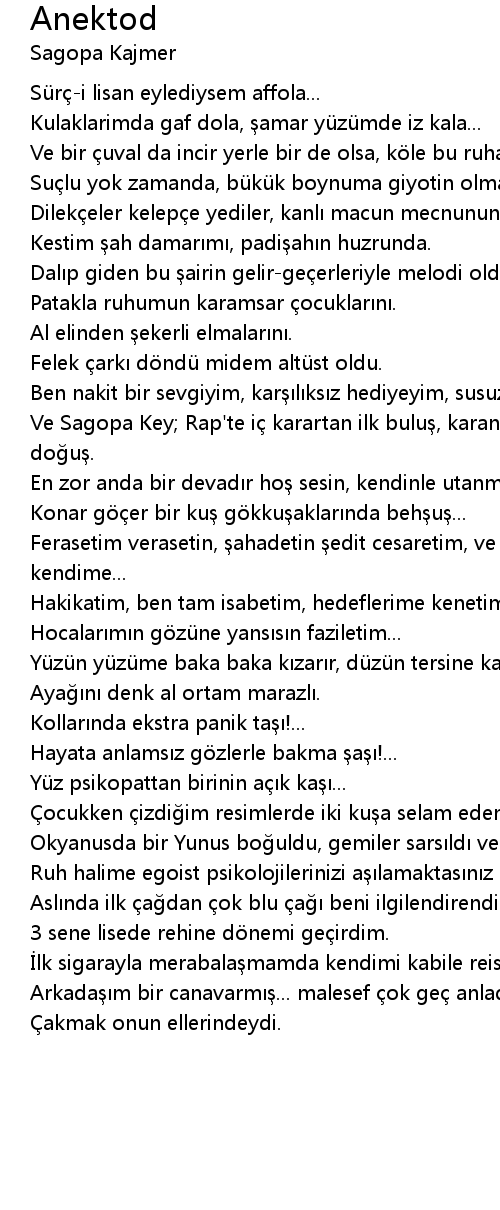 | Ve Sagopa Key; Rap'te iç karartan ilk buluş, karanlık zirvelerden gün doğuş. | |