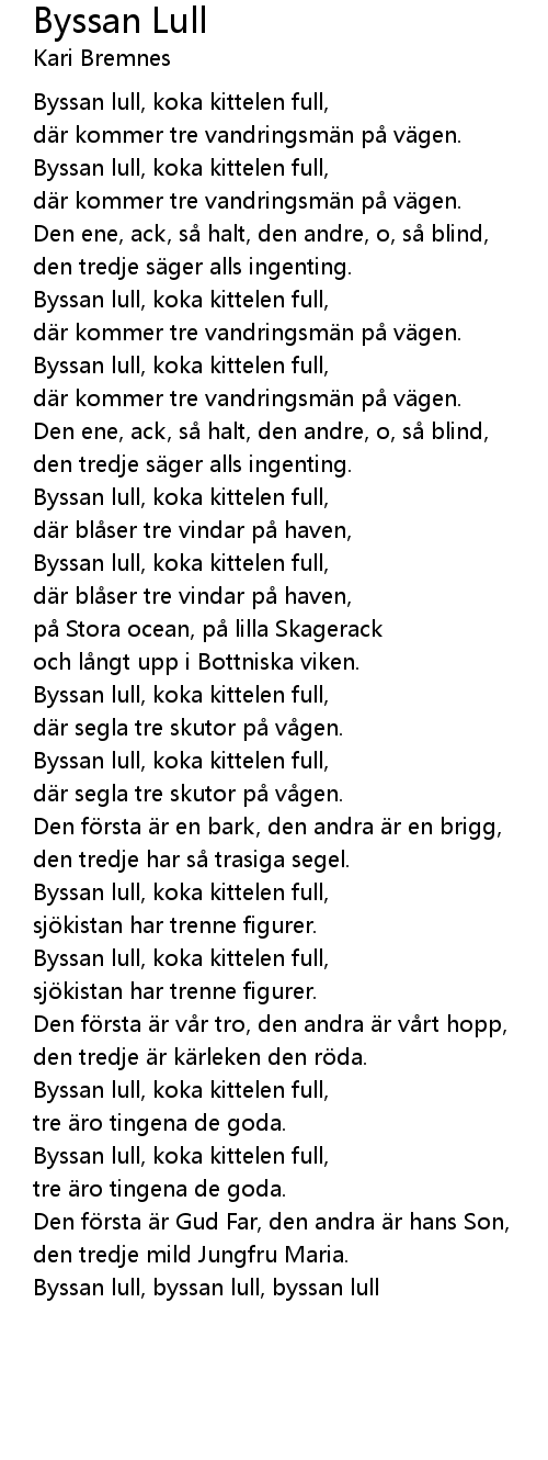 | [00:55.84] | Byssan lull, koka kittelen full, |