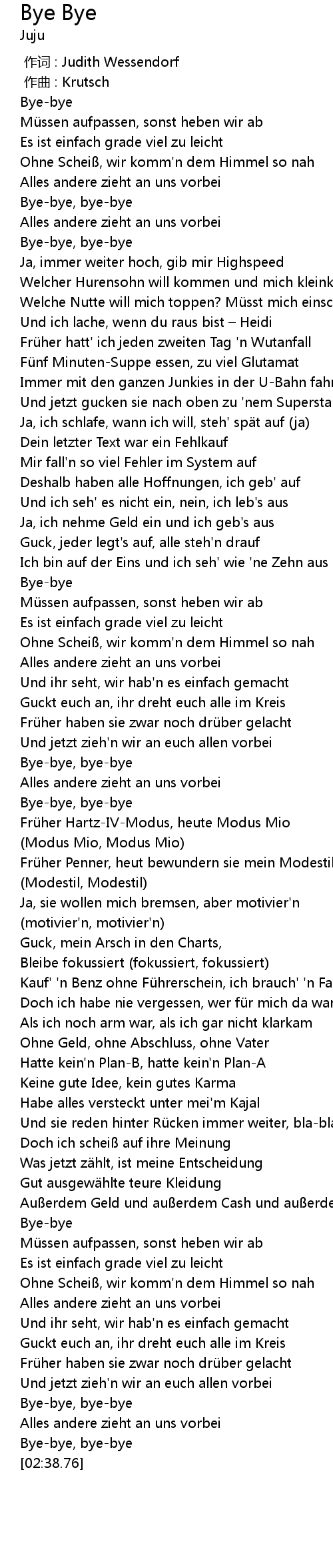 | [00:29.03] | Welche Nutte will mich toppen? Müsst mich einschließen |