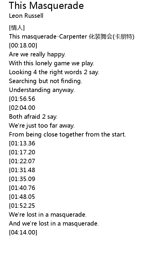 | [00:05.00] | This masquerade-Carpenter 化装舞会(卡朋特) |
