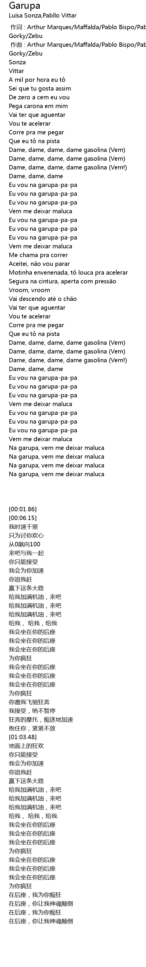 | [00:00.543] | zuo qu : Arthur Marques Maffalda Pablo Bispo Pabllo Vittar Rodrigo Gorky Zebu |
