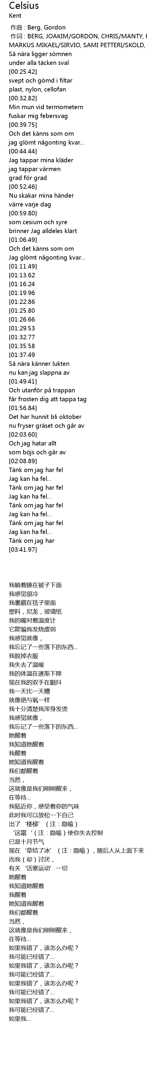 | [00:01.00] | 作词 : BERG, JOAKIM/GORDON, CHRIS/MANTY, HARRI KALERVO/MUSTONEN, MARKUS MIKAEL/SIRVIO, SAMI PETTERI/SKOLD, |