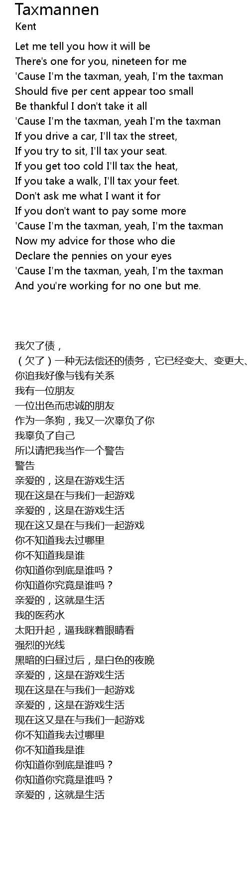 'Cause I'm the taxman, yeah, I'm the taxman |