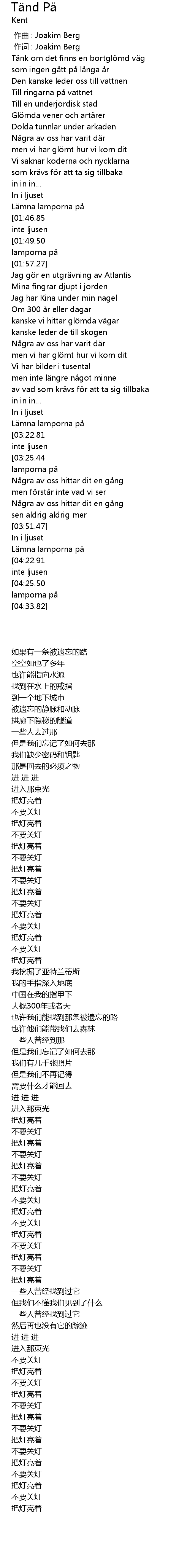 | [00:01.00] | 作词 : Joakim Berg |