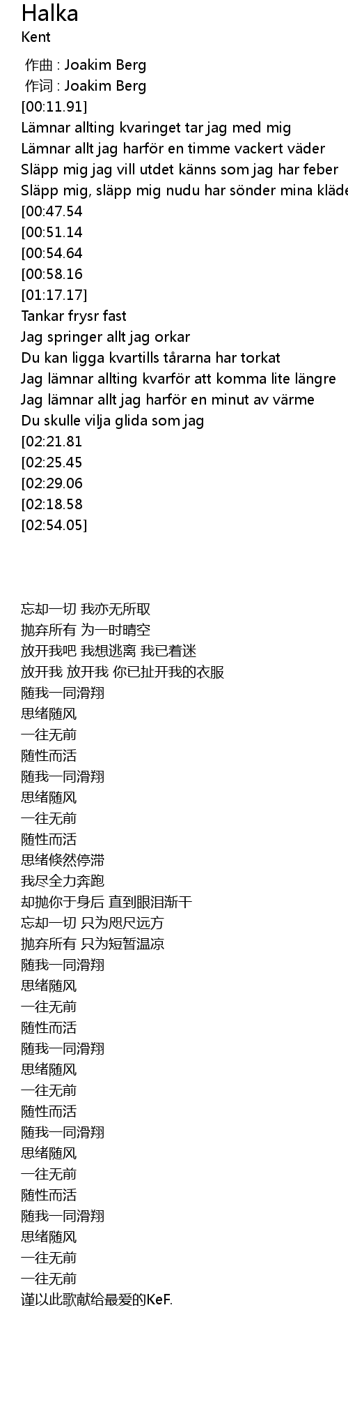| [02:33.12][02:18.58][02:04.18] | Du skulle vilja glida som jag... |