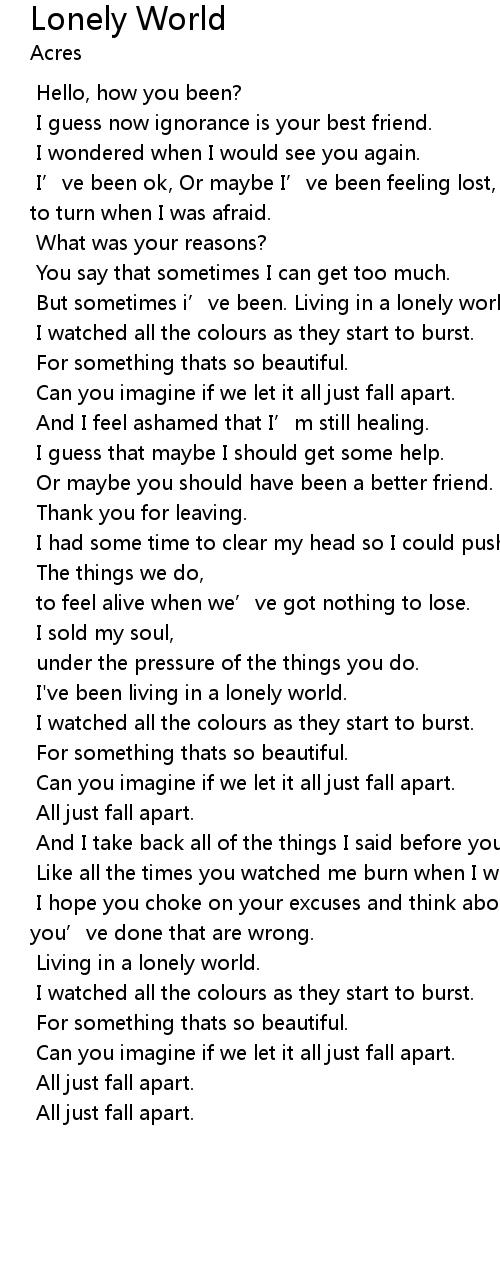 | [00:43.069] | But sometimes i’ve been. Living in a lonely world. |