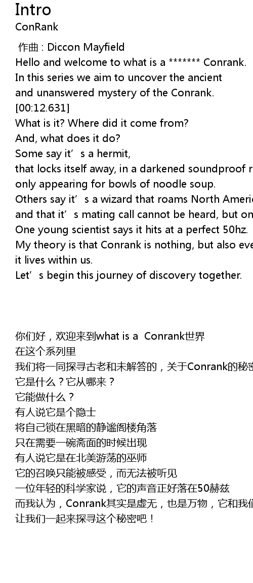| [00:09.485] | and unanswered mystery of the Conrank. |
