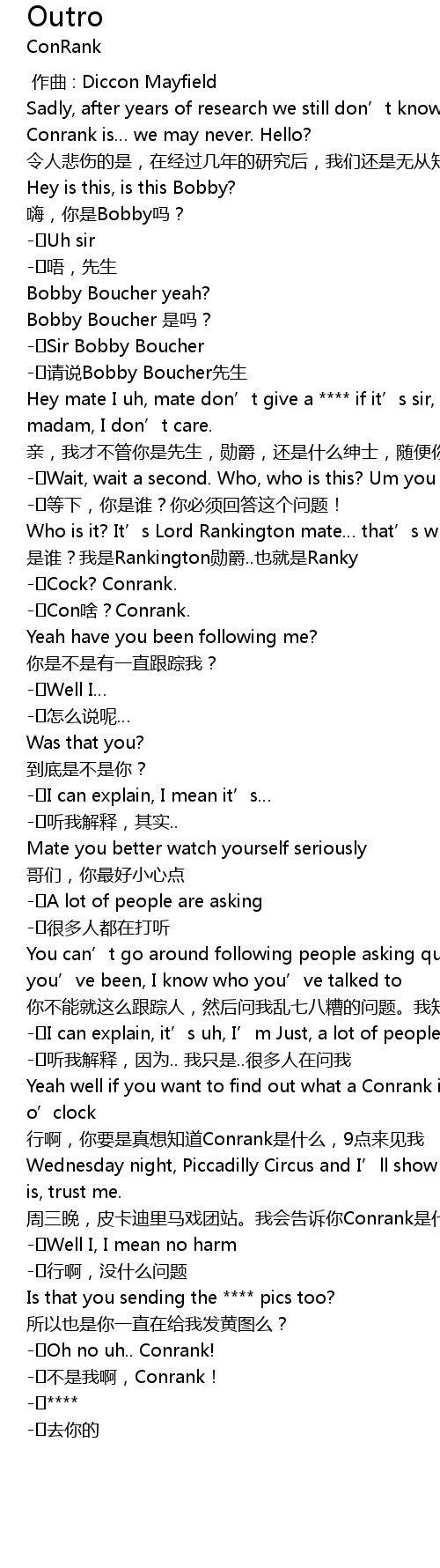 | [00:03.940] | 令人悲伤的是,在经过几年的研究后,我们还是无从知晓Conrank是什么东西..我们可能永远也不会..你好? |