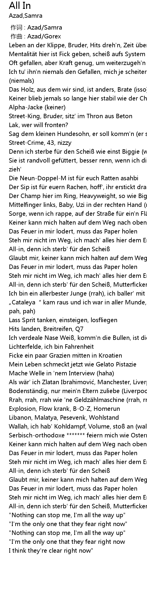 | [01:02.59] | All-in, denn ich sterb' für den Scheiß |