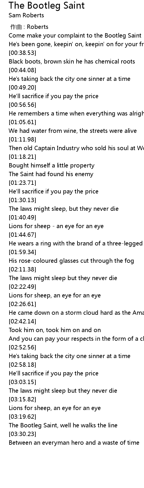 | [00:28.67] | Come make your complaint to the Bootleg Saint |